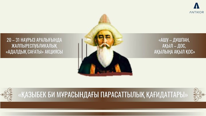 Әділдік, парасаттылық қағидаттары және дала данышпаны, Қазақ хандығының көрнекті саяси қайраткері Қазыбек бидің дана сөздері Сыбайлас жемқорлыққа қарсы іс-қимыл агенттігінің кезекті «Адалдық сағатына» арқау болды.