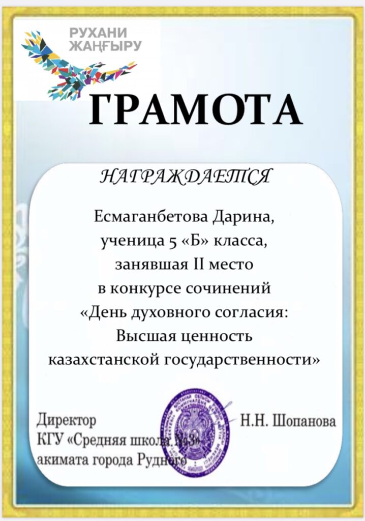 Результаты конкурса сочинений «День духовного согласия: высшая ценность казахстанской государственности». По итогам конкурса места распределились следующим образом: