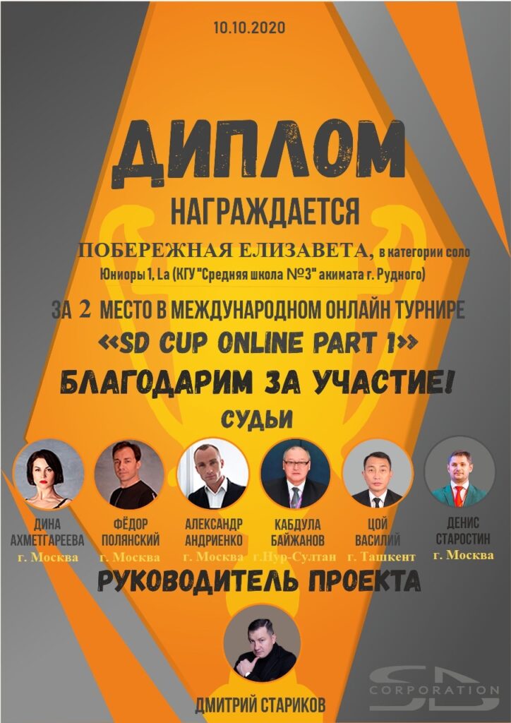 С 5 по 10 октября 2020 года, проходил международный онлайн турнир по танцевальному спорту «SD CUP ONLINE PART 1». В связи со сложившимися обстоятельствами, организаторы турнира решили впервые провести его онлайн. Руководитель проекта Дмитрий Стариков (г. Нур-Султан), организатор крупнейших международных соревнований в Казахстане, организатор Чемпионатов Республики Казахстан, пригласил влиятельную судейскую бригаду из городов: Нур-Султан, Москва, Ташкент.